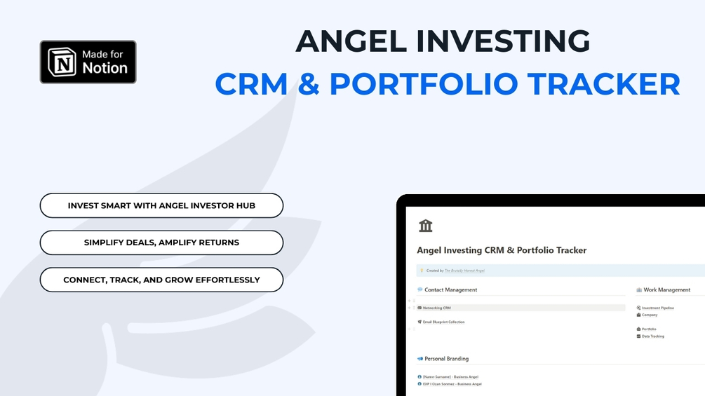Maximize your impact in the startup ecosystem with the Angel Investing CRM & Porfolio Tracker Notion Template, meticulously crafted for discerning angel investors. The Brutally Honest Angel (TBHA) brings you a comprehensive tool that enhances your investment process, nurtures your startup relationships, and streamlines your portfolio management—all in one place.