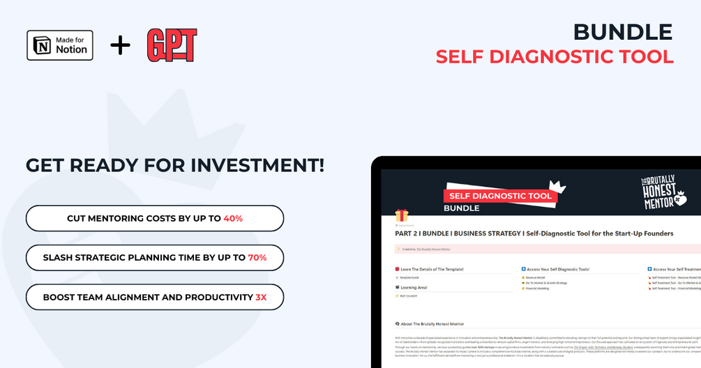 This bundle features all nine Self Diagnostic Tools, crafted to address the most critical aspects of your startup's development. Each template is packed with mentoring insights, actionable to-do lists, in-depth videos to help you understand complex topics, and its very own custom GPT to guide you with AI-driven advice in real-time. Here’s what’s included: