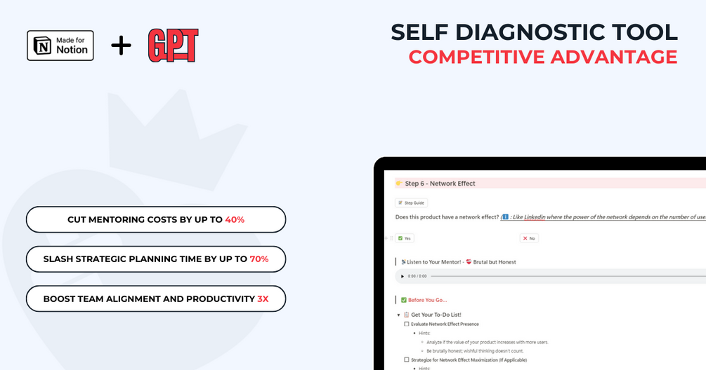 That’s where SDT I Competitive Advantage comes in. This Notion template is designed to help you discover and build your startup’s competitive advantage. Created by The Brutally Honest Mentor (TBHM), this tool guides you through 7 critical steps to uncover and leverage your unique strengths so you don’t just survive in the market—you thrive​.