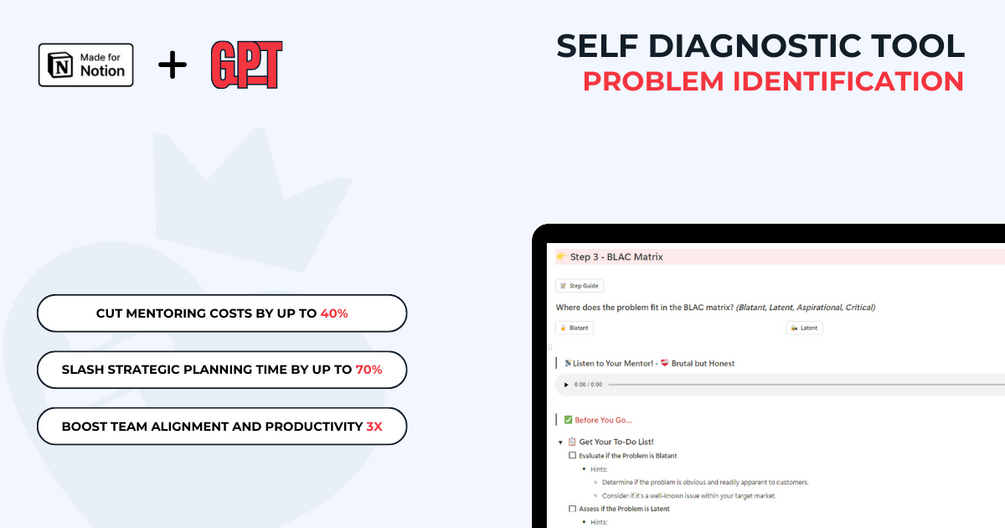You know that identifying the problem is just the start, right? If you’re serious about building a product or service that truly matters, you’ll need more than just this tool. Luckily, we’ve got other Self Diagnostic Tools Check them out here to help you cover all the essential areas for your startup.