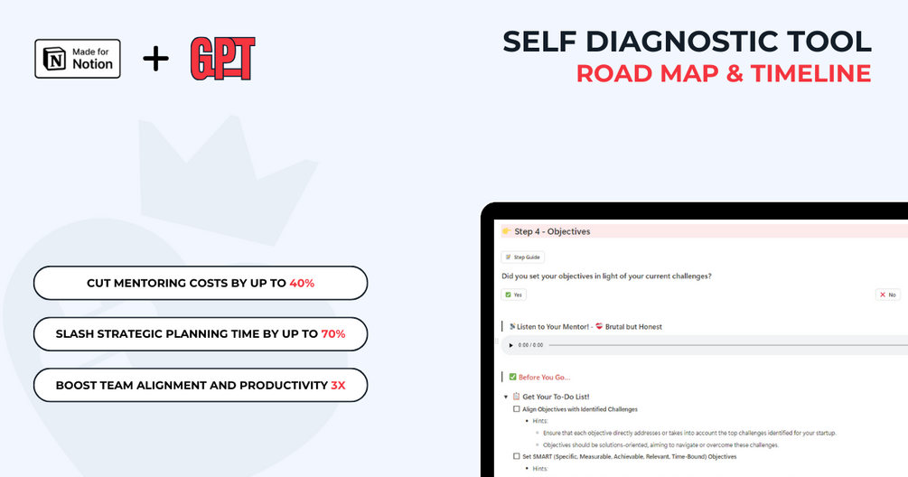 Creating a road map is just one part of the puzzle. If you want to truly set your startup up for success, you’ll need more than just timelines. Explore other Self Diagnostic Tools Check them out here to ensure your startup’s entire foundation is built for execution.